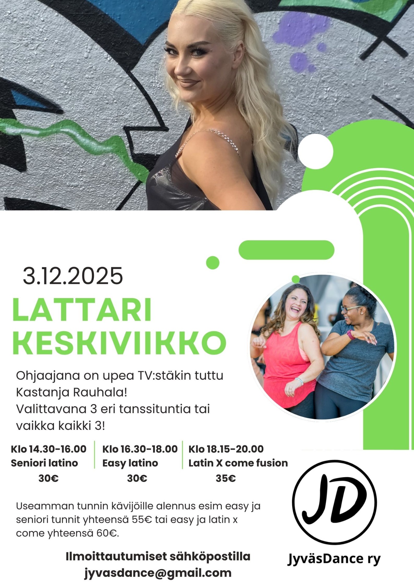 Lattari Keskiviikko by Kastanja Rauhala. Tanssi Tähtien kanssa ohjelmasta tuttu Kastanja suuntaa päiväksi Jyväskylään ja nyt on kaikilla mahdollisuus osallistua hänen innostavaan ohjaukseensa. Luvassa hikeä ja lattari rytmejä! Ilmoittudu etukäteen niin varmistat että mahdut mukaan!